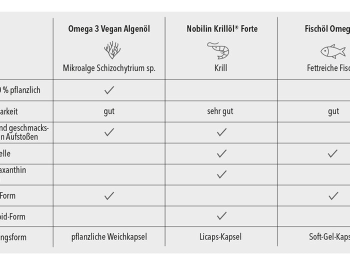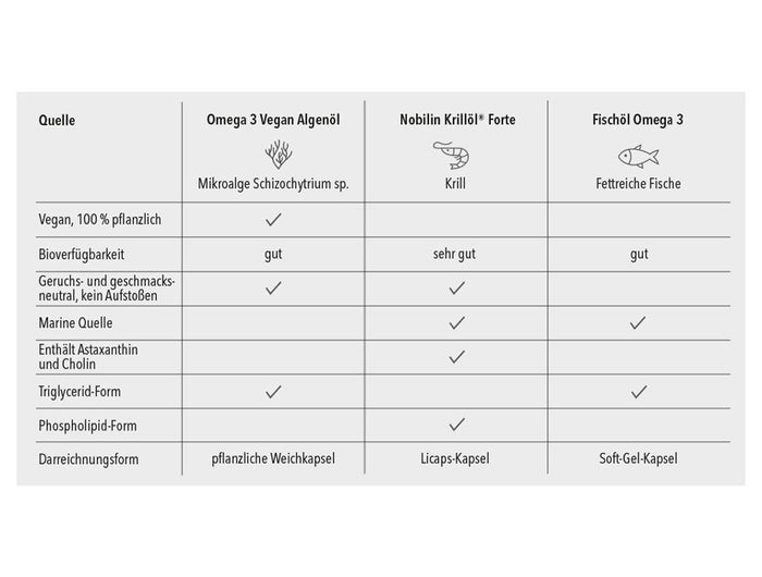 Leinöl, Fischöl, Krillöl oder Algenöl enthalten zwar Omega-3-Fettsäuren, jedoch in unterschiedlichen Formen und Zusammensetzungen. Die langkettigen Omega-3-Fettsäuren EPA und DHA kommen nur in Fischöl, Krillöl oder Algenöl vor.
