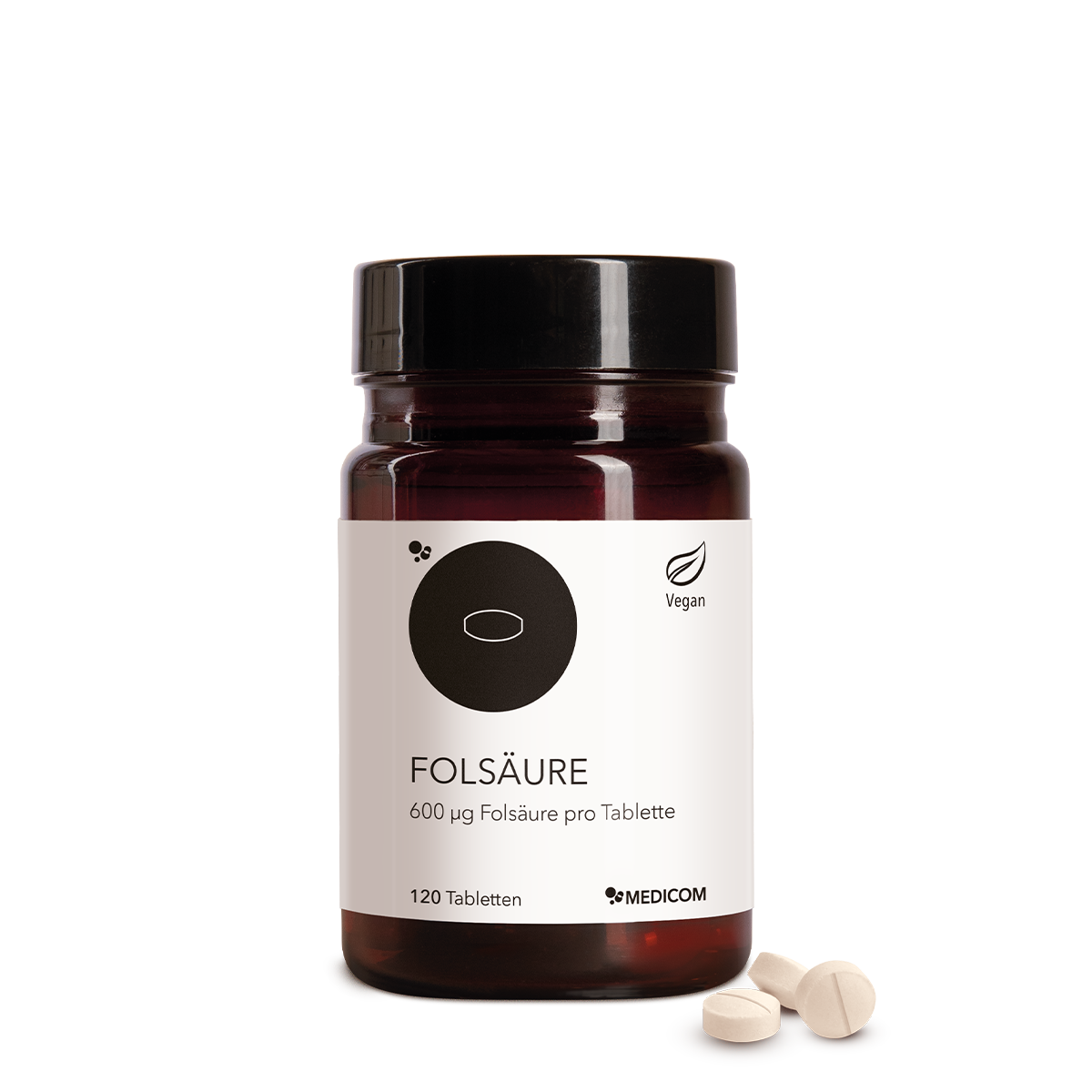 Medicom bietet mit Folsäure ein hochwertiges Nahrungsergänzungsmittel, mit dem Sie auf der sicheren Seite sind. Jede Tablette enthält 600 µg Folsäure. Sie profitieren von einer regelmäßig gesicherten Folsäure-Zufuhr aber auch dann, wenn Sie kein Kind erwarten oder stillen.