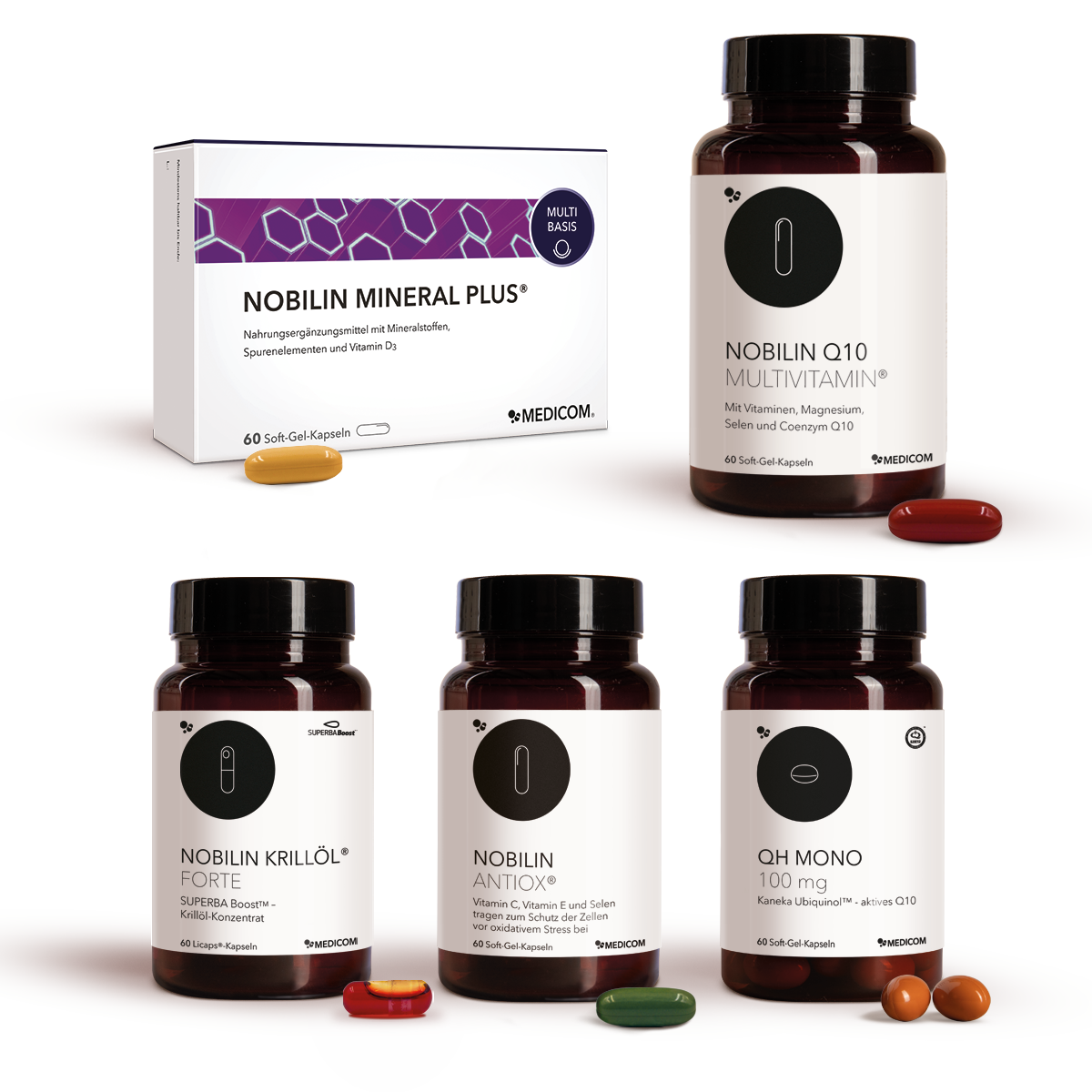 Unsere Gesundheit ist das Wichtigste. Möchten Sie Ihr Wohlbefinden optimal unterstützen? Dann ist die Nobilin Premium Selection Advance mit hochwertigem Krillöl-Konzentrat und dem Powerstoff QH (Ubiquinol) genau das Richtige für Sie. Dieses Set aus fünf exklusiven Medicom Vitalstoff-Produkten wurde speziell für Menschen entwickelt, die höchste Ansprüche an ihre Gesundheitsvorsorge stellen. Es ist für Sie die absolute Spitzenklasse in Sachen Gesundheit.