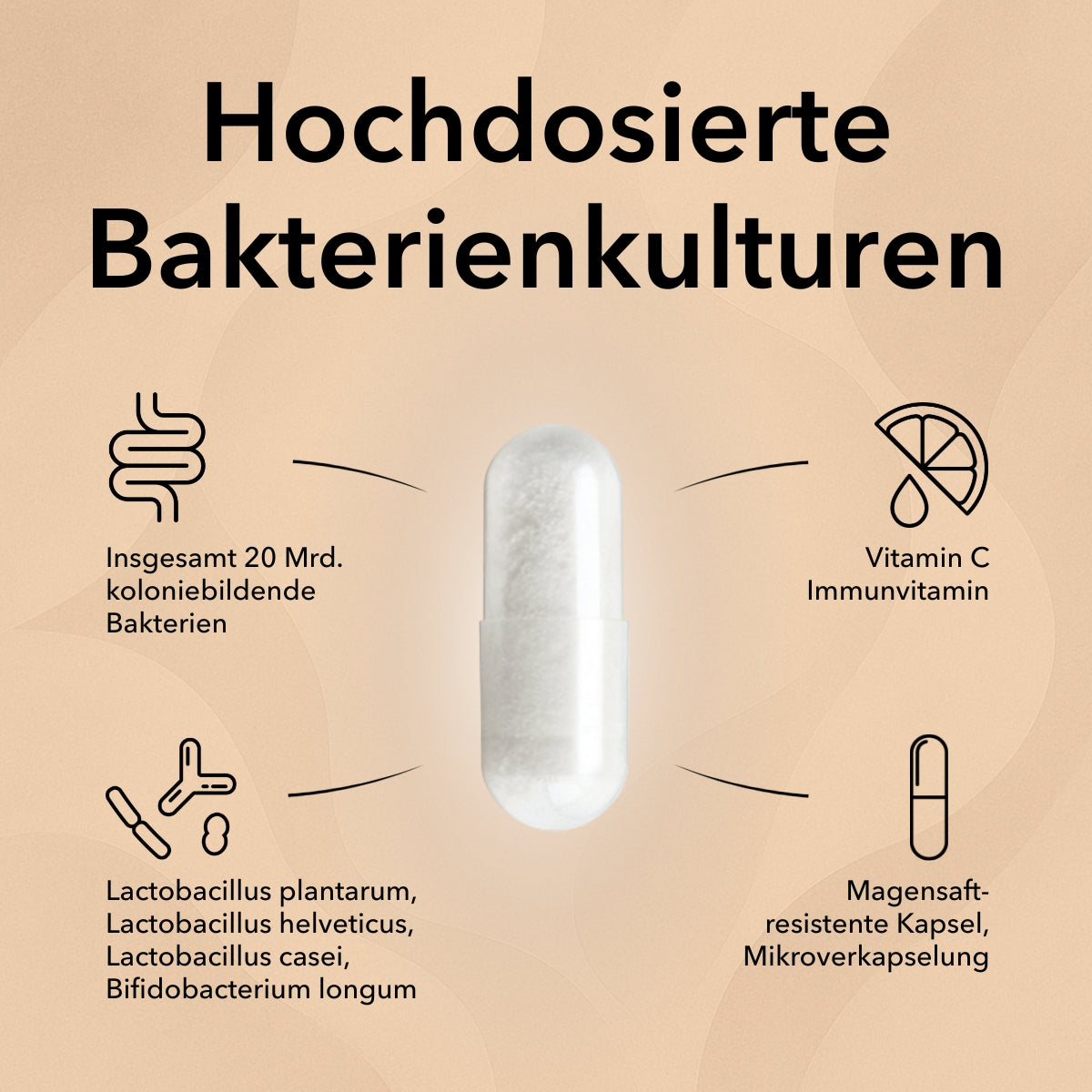 Studien zeigen, dass hochwertige Bakterienkulturen wie Lactobacillus helveticus, Bifidobacterium longum, Lactobacillus casei und Lactobacillus plantarum das Mikrobiom stärken und das Gleichgewicht der Darmflora fördern können. Damit unterstützt eine starke Darmgesundheit den Körper, stressige Situationen besser zu bewältigen und die mentale Gesundheit zu fördern.